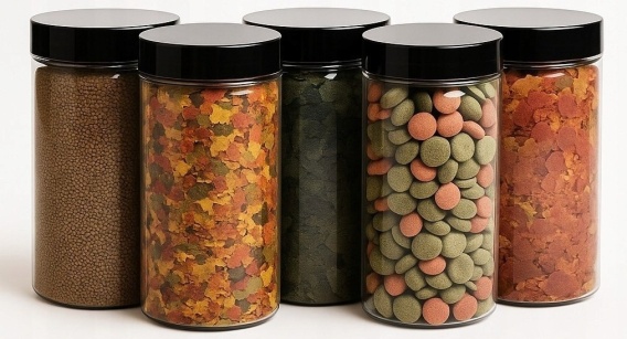 Każdy słoik zawiera inny rodzaj pełnowartościowej karmy – razem tworzą kompletny zestaw żywieniowy dla ryb w akwarium:
