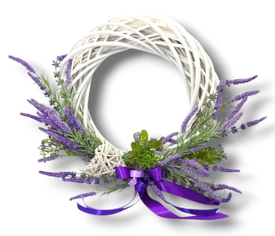 Wprowadź do swojego wnętrza odrobinę uroku i świeżości dzięki wyjątkowemu wiankowi dekoracyjnemu! Subtelna kompozycja lawendy, zieleni i białej plecionki sprawia, że będzie on doskonałą ozdobą zarówno do wnętrz, jak i na drzwi wejściowe. Idealny jako całoroczna dekoracja, a także na specjalne okazje, np. święta, wesela czy jako stylowy prezent.