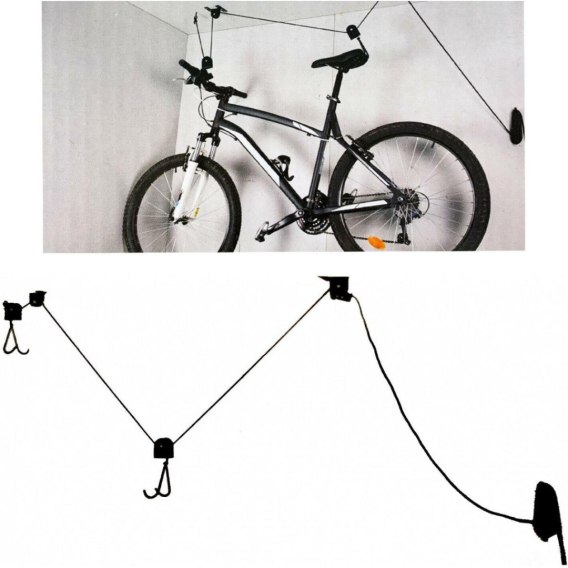 Dzięki długiej linie dołączonej do zestawu, rower nie tylko w prosty sposób wciągniesz pod sufit do maksymalnej wysokości 4 metrów, ale też wygodnie zawiesisz na dowolnej wysokości podczas naprawy.