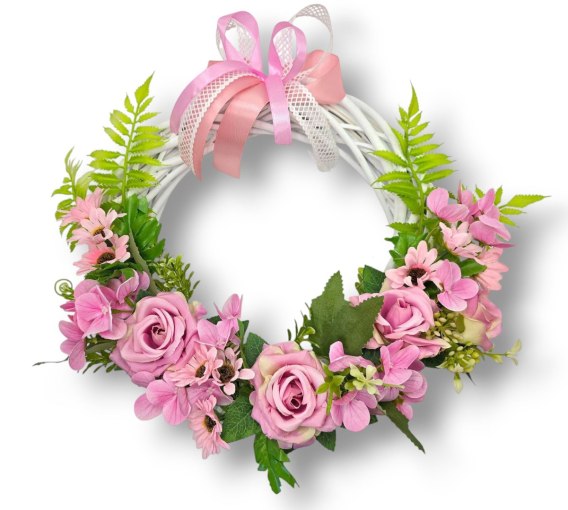 Wprowadź do swojego wnętrza odrobinę uroku i świeżości dzięki wyjątkowemu wiankowi dekoracyjnemu! Subtelna kompozycja kwiatów, zieleni i białej plecionki sprawia, że będzie on doskonałą ozdobą zarówno do wnętrz, jak i na drzwi wejściowe. Idealny jako całoroczna dekoracja, a także na specjalne okazje, np. święta, wesela czy jako stylowy prezent.