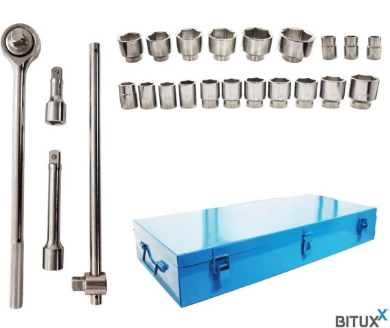 Zestaw nasadek Bituxx 3/4" stworzony do najcięższych prac - ciężarówki, maszyny rolnicze, sprzęt budowlany, konstrukcje stalowe. Tam gdzie zwykłe 1/2" komplety pękają lub ślizgają się - ten zestaw wytrzymuje ekstremalne momenty obrotowe.