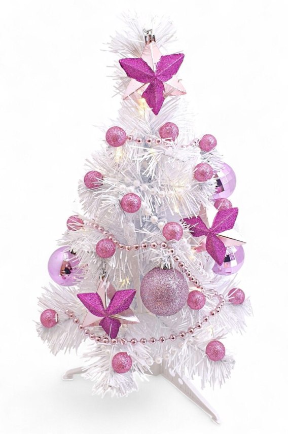 GOTOWA MAŁA CHOINKA BIAŁO RÓŻOWA UBRANA 40cm + ŚWIATEŁKA