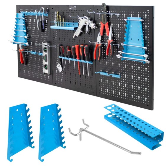 Trójczęściowa ścianka narzędziowa z 25 uchwytami i solidną stalową konstrukcją. Modułowe panele, łatwy montaż i estetyczny wygląd zapewniają porządek oraz profesjonalizm w każdym warsztacie.